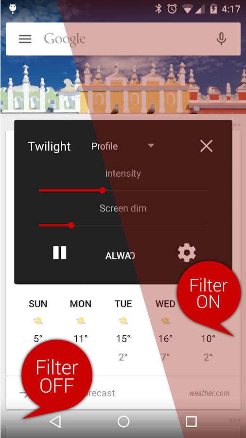 شهل تستخدم هاتفك الذكي لوقت طويل وفي وقت متاخر في المساء سواءً انت ام اطفالك ؟ اذا بهذا التطبيق الحل تشير الأبحاث الأخيرة إلى أن التعرضلضوء الأزرق قبل النوم قد تشوه بعض خواصك اليومية الطبيعية ويسبب عدم القدرة على النوم وبهذا التطبيق سوف يكون حلها, وعند تفعيل التطبيق يقوم بتمويه اللون الازرق المنبعث من هاتفك ويحمي عينك عن طريق اظهار مرشحات حمراء اللون على شاشة هاتفك وهذه هي الفكرة.