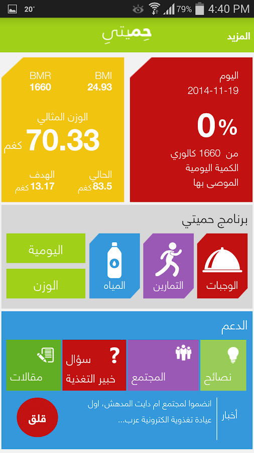 شتطبيق الحمية الاول في العالم العربي, الذي يوفر خصائص قوي للمستخدم العربي وهو التطبيق الوحيد الذي يوفر لك خاصية الصيام وبصورة عامة هو عيادة و نظام علمي الكتروني للحمية و التغذية يعتمد على القواعد العلمية للتغذية و الحمية و مراعاة التوازن بين العناصر الغذائية من الكربوهيدرات و البروتين و الدهون والخ…